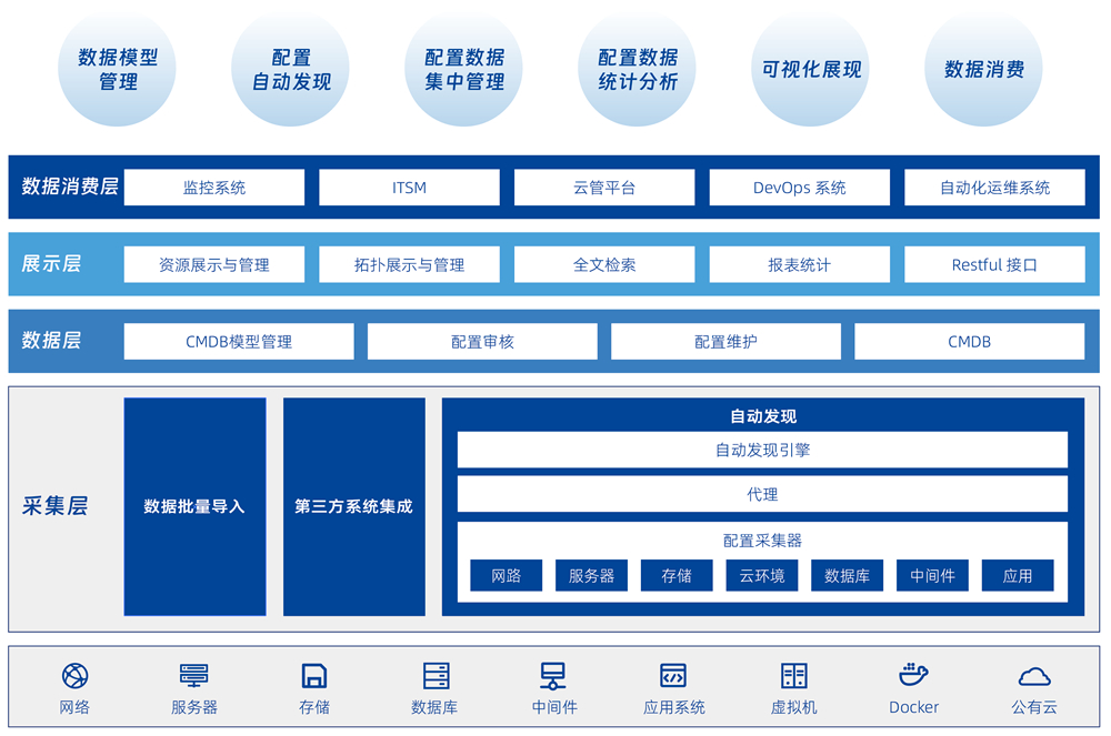 帮助用户建立统一的运维主数据,通过各种自动化手段实现以应用为核心的全面资源管理以及运维消费场景共享。系统具备灵活的 CMDB 分层建模和配置信息维护机制,可以提供面向业务的 IT 架构画像,为各个运维工具提供集中化的资源信息管理和协同,为 IT 运维和 DevOps 体系下的各种运维场景提供数据消费服务。
