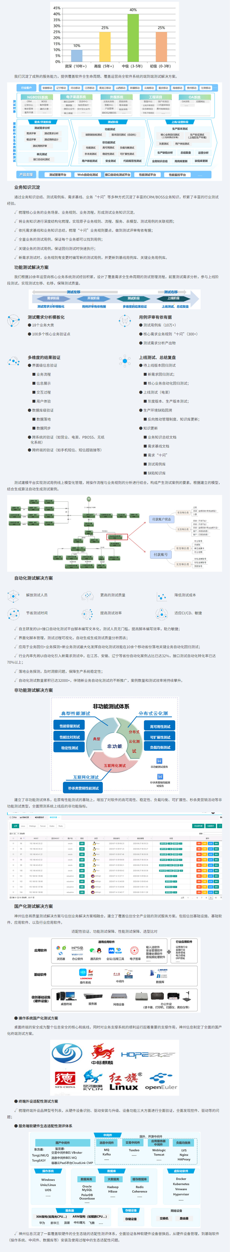 本方案为运营商行业业务系统体系下的测试解决方案,具备成熟的服务体系,专注于为运营商行业提供全面的软件测试服务。我们拥有18年的测试知识经验积累,在全国范围内建立了强大的测试团队,拥有500+的运营商行业测试技术人才储备。
