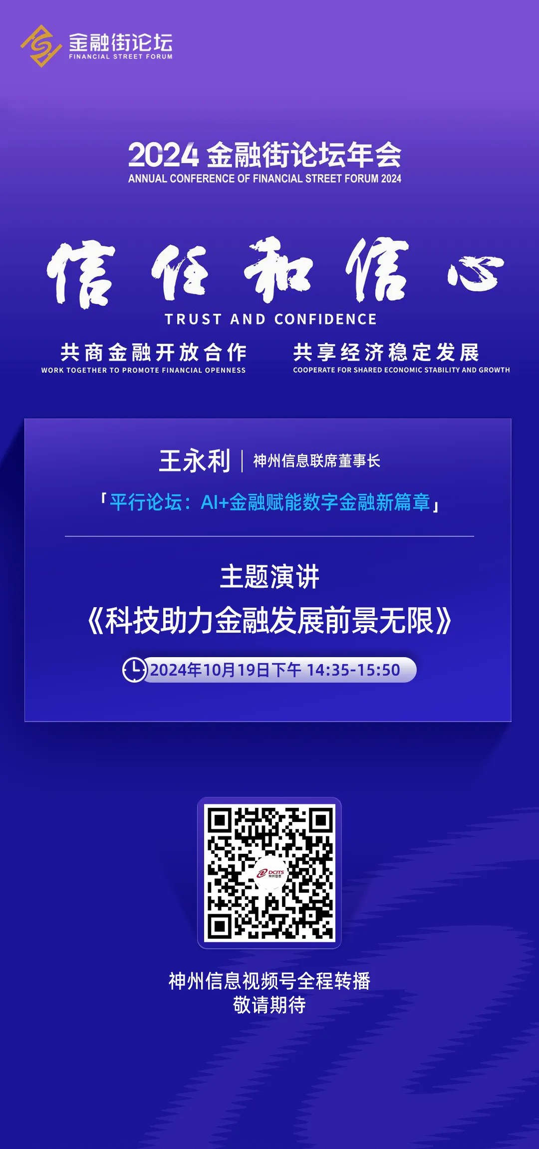 以“信任和信心——共商金融开放合作 共享经济稳定发展”为主题的2024金融街论坛年会将于10月18日至20日在北京金融街举办,神州信息受邀参与多项活动。10月19日下午14:00,平行论坛——AI+金融赋能数字金融新篇章,神州信息联席董事长王永利将发表主题演讲,神州信息视频号全程同步转播,敬请关注。