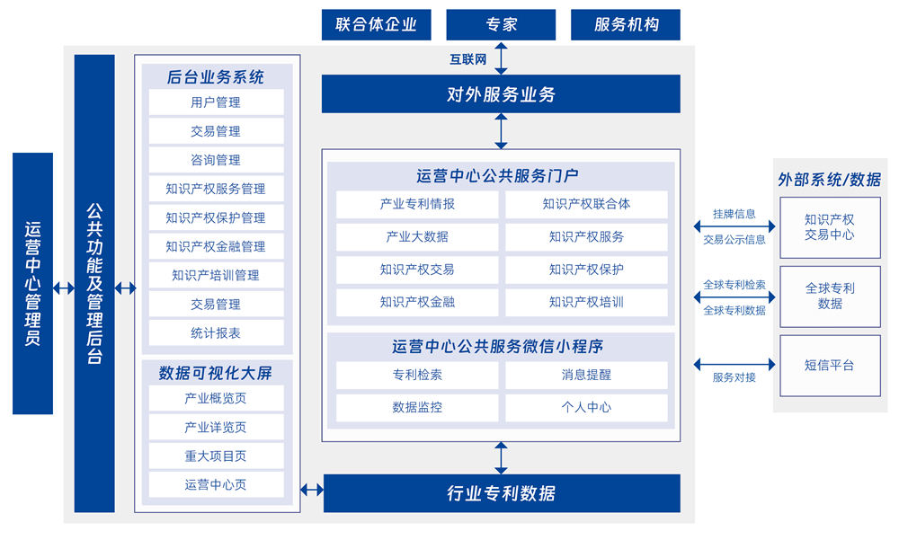 产业知识产权运营支撑平台以数字化创新技术辅助提升产业知识产权创造、运用、保护、管理和服务水平,平台采用“一库四中心”模式,即产业专利专题库和数字支持中心、创新服务中心、运营交易中心、交流合作中心,采用数字化驱动产业知识产权运营,推动产业知识产权多元化保护,支撑推动开发许可落地实施,多渠道推动产业运营高质量发展,持续构建多放共赢的产业运营生态圈。