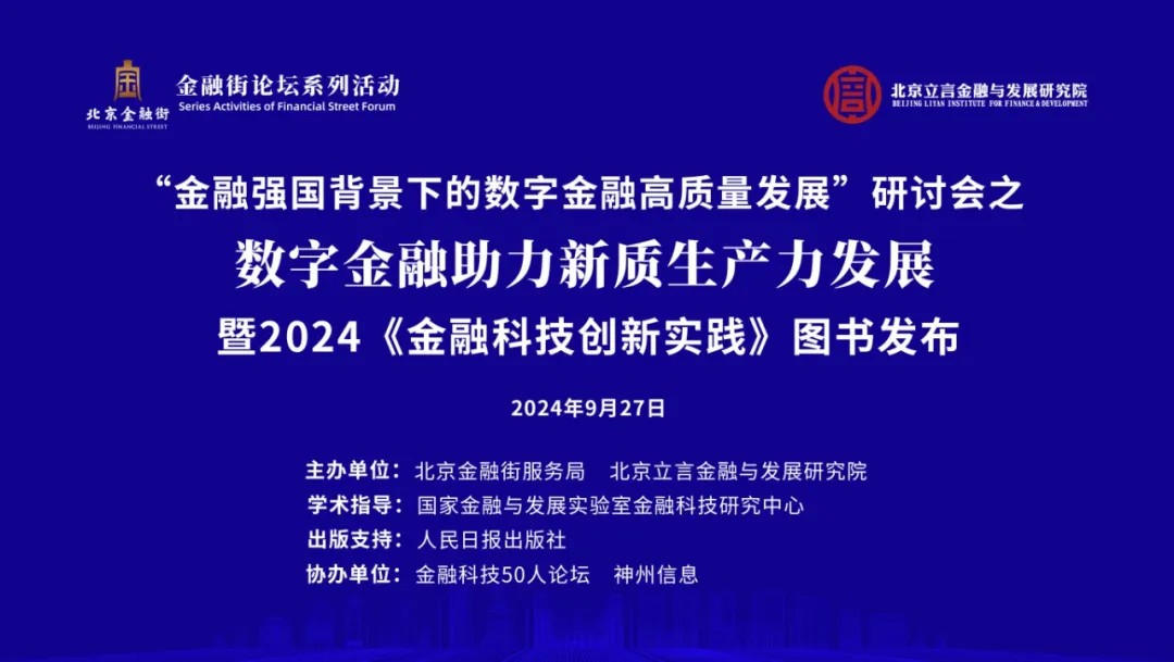 2024年9月27日,“金融强国背景下的数字金融高质量发展”研讨会之“数字金融助力新质生产力发展暨2024《金融科技创新实践》图书发布”在北京金融街i客厅成功举办。本次活动是在国家金融与发展实验室金融科技研究中心学术指导下,人民日报出版社出版支持,北京金融街服务局与北京立言金融与发展研究院联合主办,金融科技50人论坛、神州信息协办。